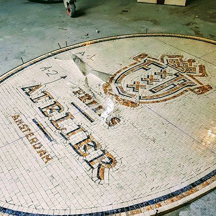 De nieuwste vestiging van Sergio Herman’s Frites Atelier in Brussel. De wanden zijn halfsteens betegeld met handgemaakte wandtegels (zie het kleine maatverschil) van een Belgische artisane. Ze heeft tegels met in- en uitwendige hoeken gemaakt wat hoekprofielen en kitnaden overbodig maakt. De echte eyecatcher ligt op de vloer bij de ingang. Hier hebben wij dit prachtige mozaïektableau gemaakt en ter plaatse afgewerkt met een messing hoekprofiel. Nog een hele klus om dit perfect ovaal te krijgen…